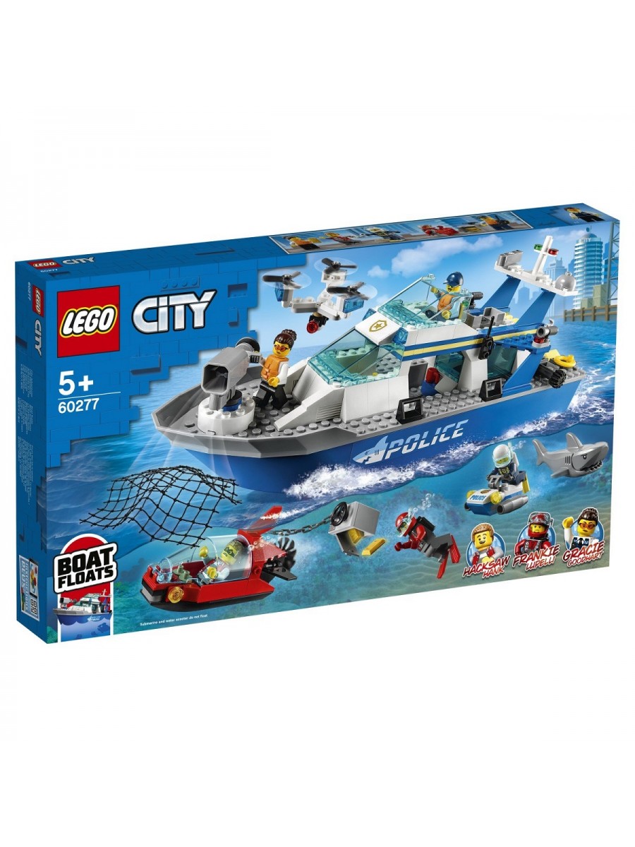 Лего Сити Полицейский катер Lego City 60277 В наборе 276 деталей, 5 минифигурок. С конструктора можно собрать огромный плавающий катер, на котором есть все — каюта капитана, стреляющий сетемет, центр управления беспилотниками и многое другое. И это еще помимо крутого дизайна, с его безупречными линиями, стильной окраской и большим количеством интересных безделушек.