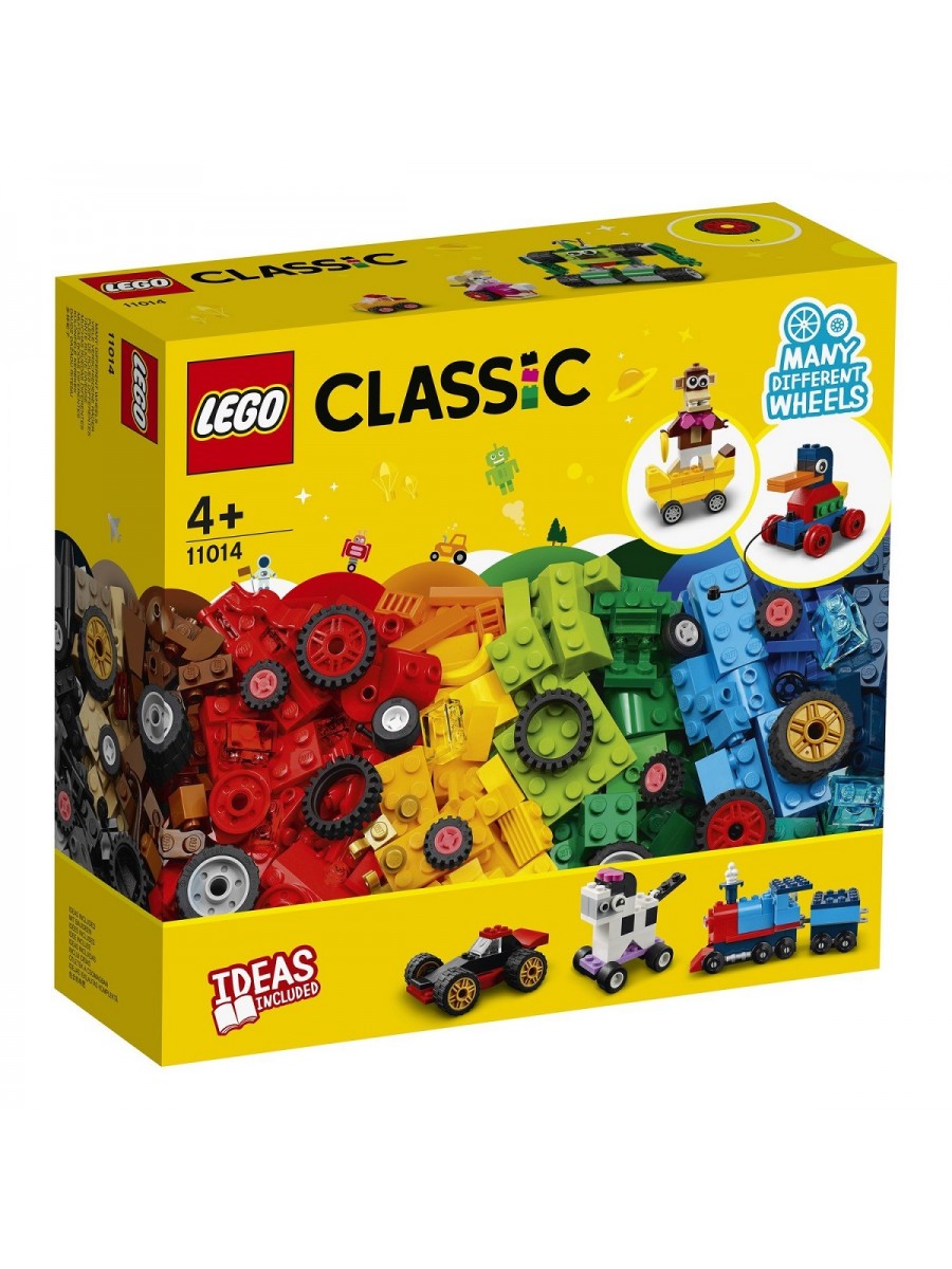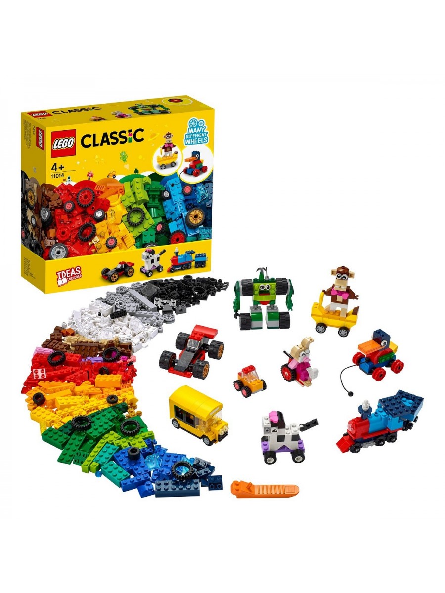 Конструктор Лего Классик Кубики и колёса Lego Classic 11014. Все, что нужно детям, чтобы построить автомобиль, поезд, школьный автобус, робот, зебру на скейтборде, гоночный автомобиль, кролика в коляске, утку на веревке и обезьяну на банановом скейте. Идеально подходит для детей от 4 лет. Дети будут наслаждаться игрой с этими забавными игрушками LEGO. Поскольку каждая модель обладает простыми и цифровыми инструкциями, даже новички смогут создавать игрушки LEGO с гордостью и радостью. В наборе - 653 детали.