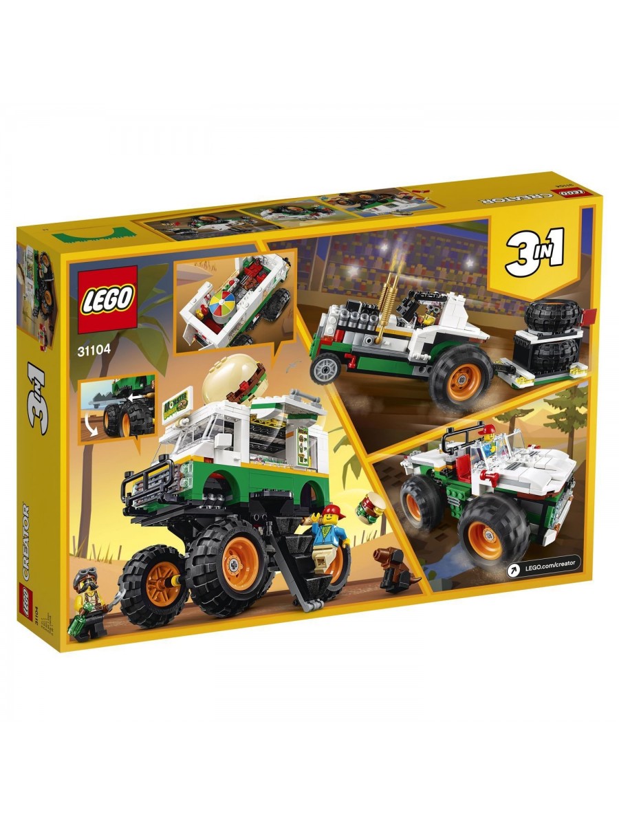 Лего Креатор Грузовик Монстрбургер Lego Creator 31104. Этот удивительный автомобиль поможет развезти вкусные бургеры жителям сказочной страны, живущим не только в городе, но и в деревне, в труднопроходимых местах. Для него нет непреодолимых препятствий. Поднявшись по лесенке, можно отправиться в рейс по доставке вкусной еды. Большие колеса и мощная подвеска помогают передвигаться по пересеченной местности.