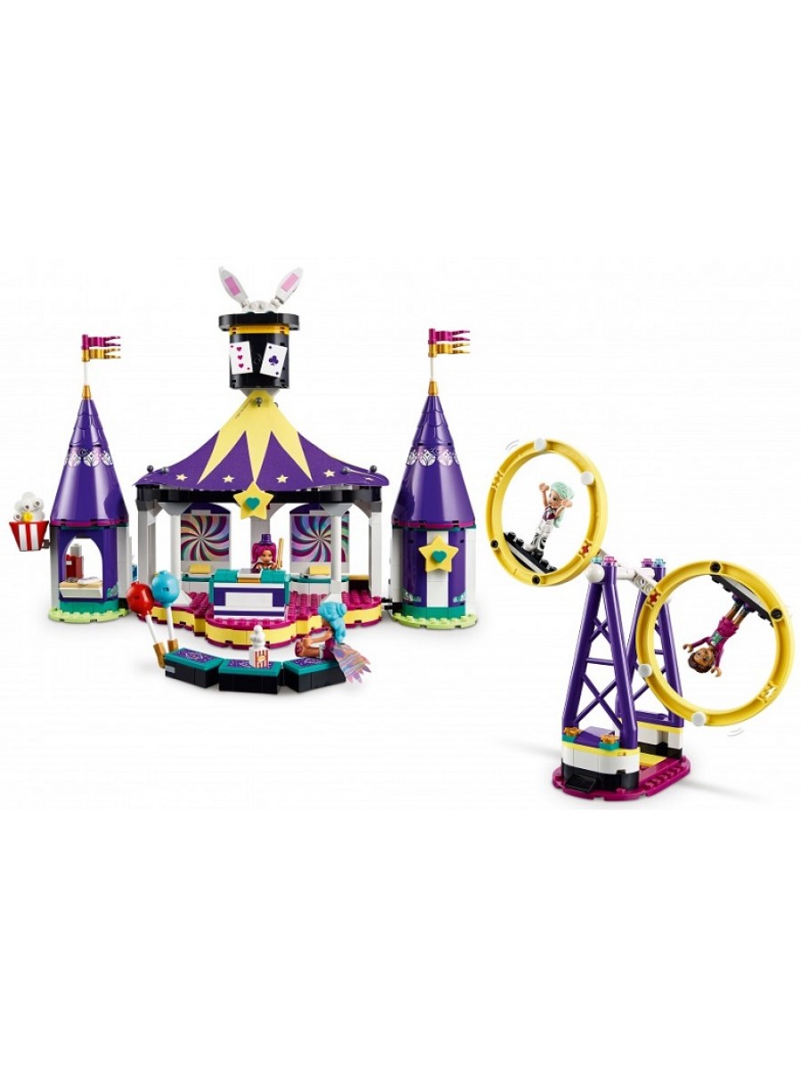 В этом большом наборе есть 4 минифигурки, также здесь есть 2 аттракциона, 2 волшебных фокуса, прилавок с попкорном, фотобудка и большой шатер-шапито с тканевой крышей, где проходит представление. Размеры шатра-шапито составляют более 27 см в высоту и 34 см в ширину, а американских горок — более 13 см в высоту и 52 см в ширину. Здесь множество аксессуаров, которые дают вдохновение для историй о представлениях, — например, жонглерские булавы, сценический макияж и воздушные шары. Светящиеся в темноте кубики оживают, когда гаснет свет. Набор совместим с Лего Френдс Волшебная акробатика Lego Friends 41686