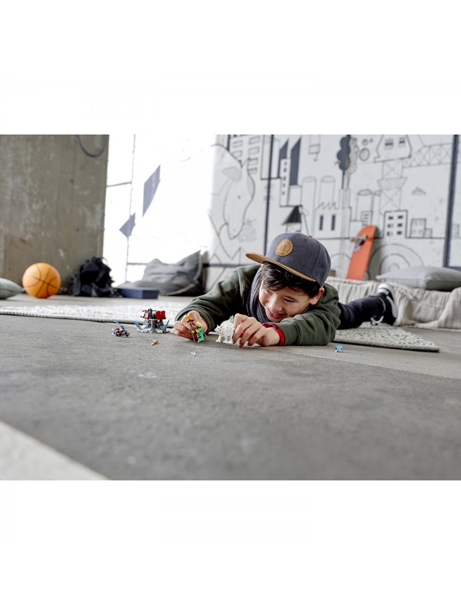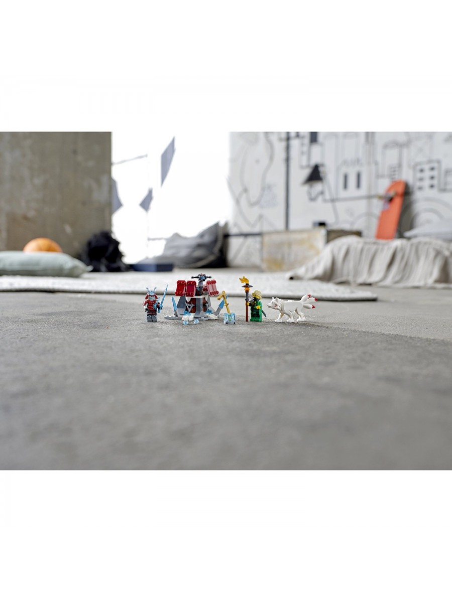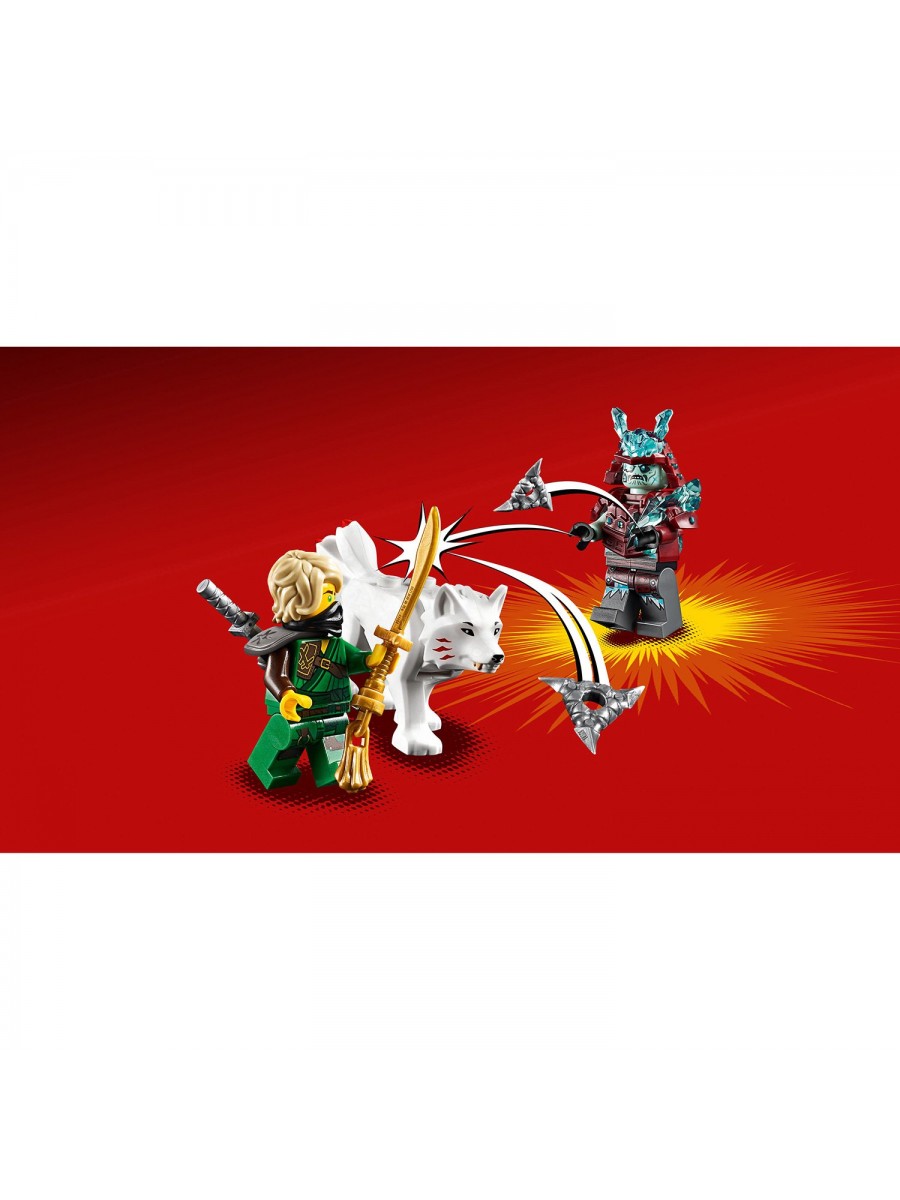 Чтобы вернуть Золотой меч Ллойда, придется отправиться в большое путешествие. Только так можно попасть в необычное Никогда-королевство, где царствует мороз. Хорошо, что дорогу преодолевать придется не в одиночку. Рядом буде ниндзя NINJAGO® Ллойд Гармадон и его верный товарищ – белый волк. Охраняет меч в своей крепости Воин метели, с которым придется принять бой, вооружившись пылающим факелом и катаной Ллойда.