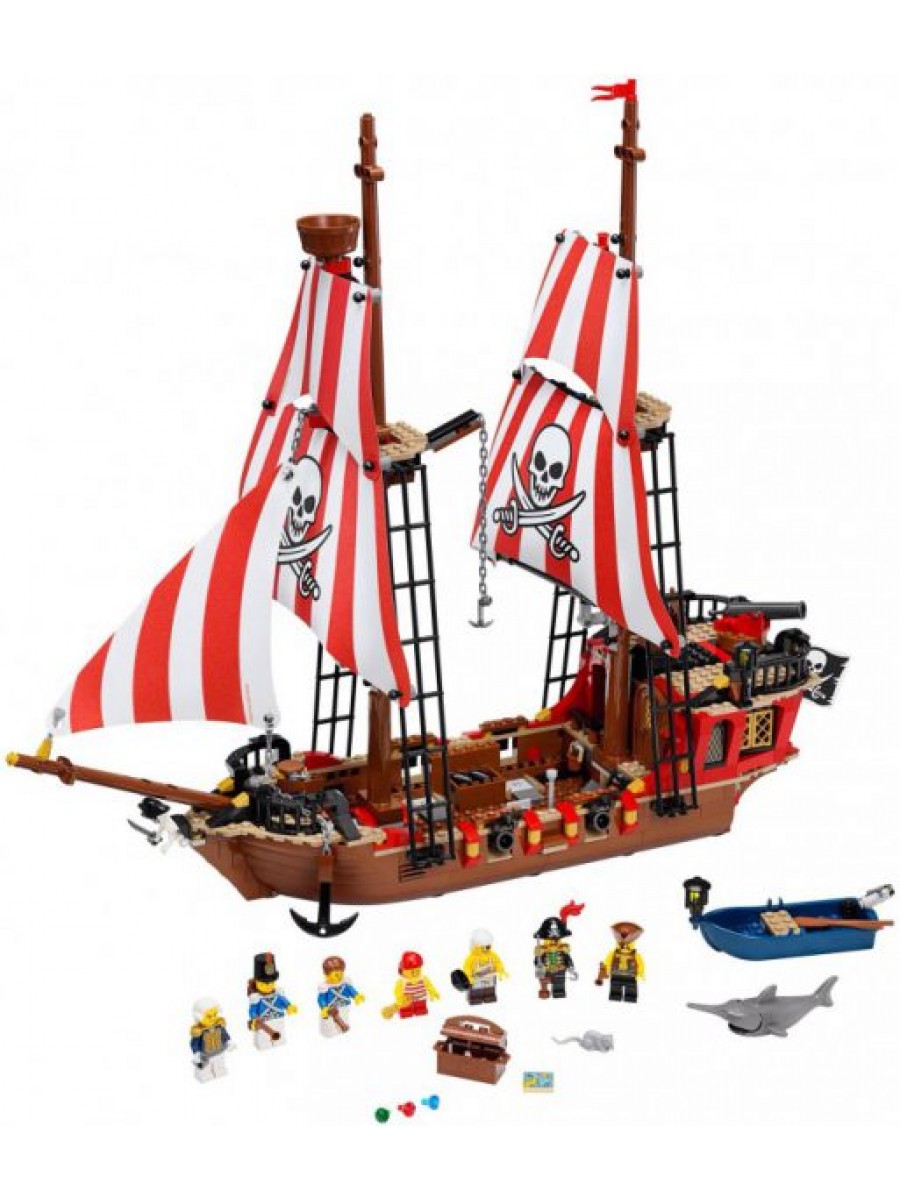 Гадкие пираты направляются в открытое море на своем быстроходном галеоне с сундуком, полным награбленных вещей, спрятанных в трюме. Но матросы их догнали на гребной шлюпке и готовы к сражению! Помоги матросам захватить судно и вернуть украденные сокровища. Яростно иди на абордаж и взбирайся на корабль. Вытащи оружие и победи подлых пиратов. Сделав это, отправь негодяев за решетку и хорошенько запри! В потрясающем наборе с кораблем Брик Баунти из серии LEGO® Pirates (пираты) 2 высоких мачты с огромными парусами, оснастка и марсовые площадки, Веселый Роджер, рабочая лебедка с якорем, пушки, функция «иди по доске» (чтобы сбросить пленного в море) и рыба-пила. В набор входит скелет и 7 минифигурок с разнообразным оружием и аксессуарами: капитан пиратов, пиратский старпом, пиратский юнга, пиратский кок, адмирал, морской сержант и моряк.