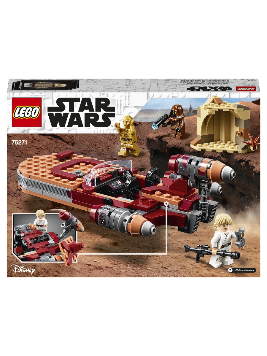 Лего Стар Варс Спидер Люка Сайуокера Lego Star Wats 75271 конструктор посвящен IV эпизоду Звездных Войн: Новая надежда. Он состоит из 236 деталей, которые вместе образуют легендарный спидер Люка Скайуокера. Также не стоит забывать об интересных фигурках самого Люка Скайуокера, воина Джавы и небольшого робота С3РО. С их помощью вы сможете полностью воспроизвести знаменитую сцену из фильма или придумать свою собственную историю. Конструктор отлично подходит мальчикам возрастом от 7-ми лет и будет интересен даже тем, кто не знаком с фантастическим фильмом.