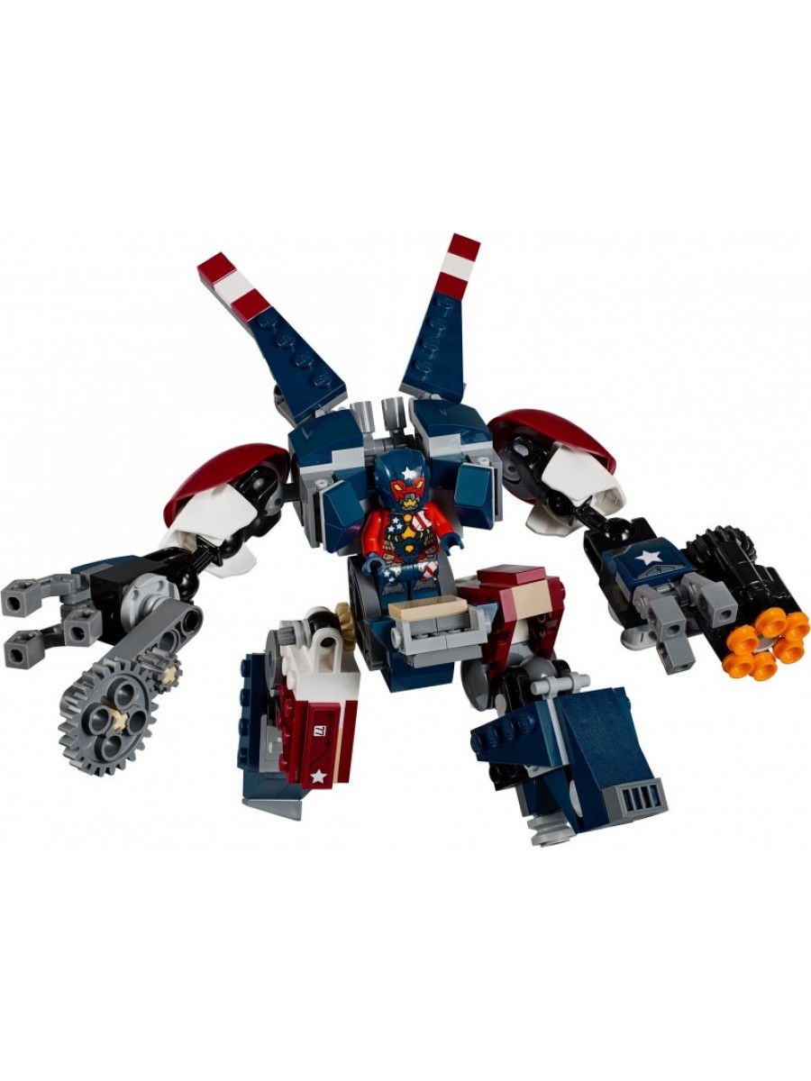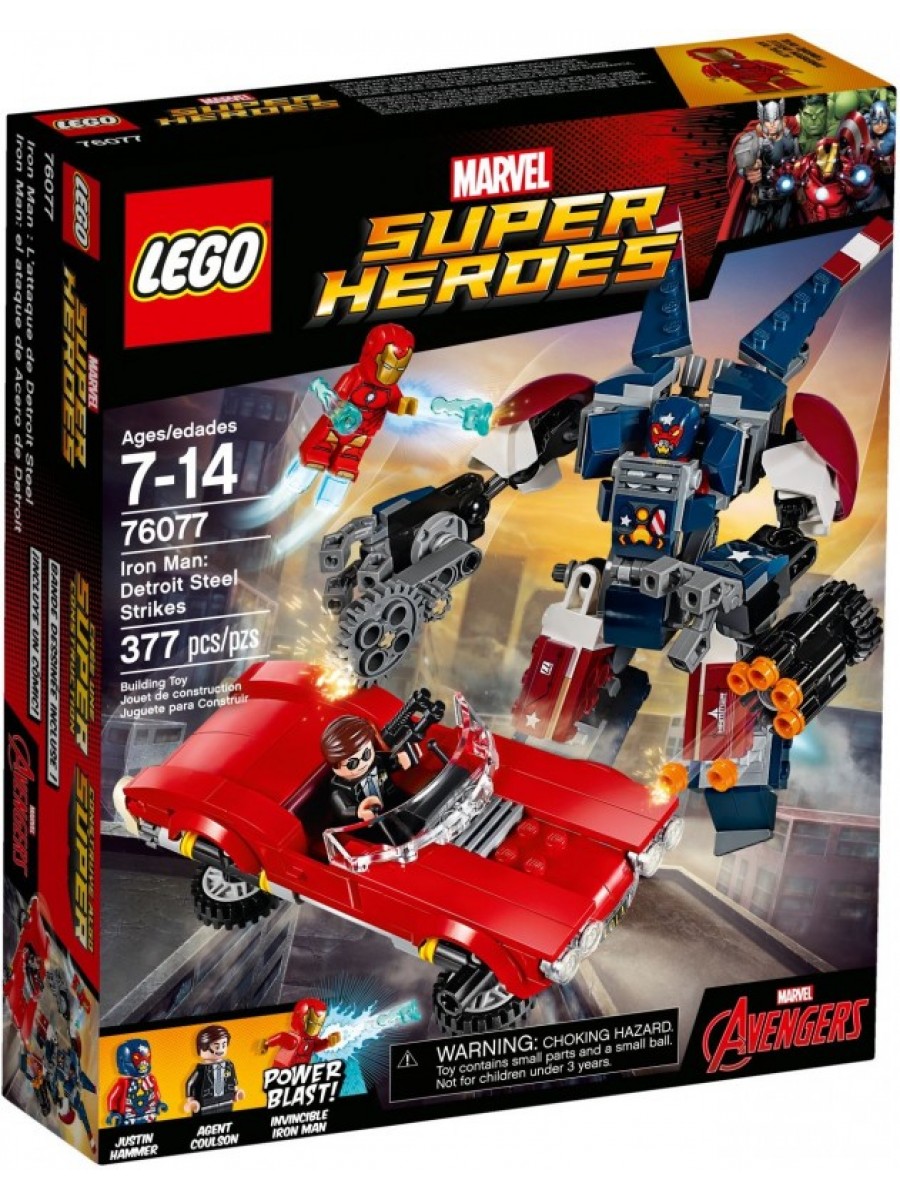 В выпуске лего 76077 Железный человек: Стальной Детройт наносит удар (оригинальное название - Lego 76077 Iron Man: Detroit Steel Strikes) лава оружейной корпорации мечтает поквитаться с агентом Колсоном и сам садится за рычаги разрушительного меха. Механический громила уже безжалостно орудует циркулярной пилой и шестиствольным шипометом! К счастью, сотрудник Щ.И.Та тоже способен за себя постоять до появления супергероя. Его красный кабриолет с уникальным номером LOLA умеет летать!
