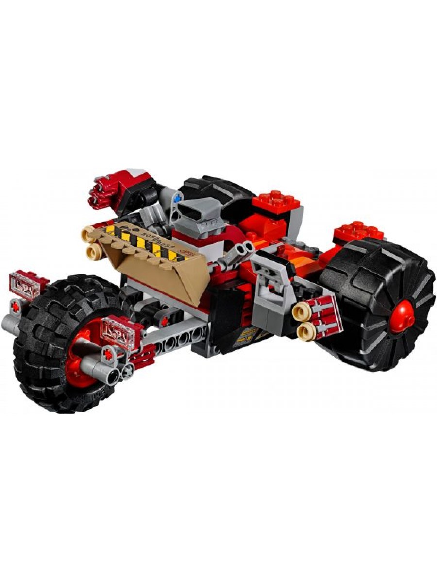Машина Красных Халков трёхколесная, выполнена в красно-черной цветовой гамме, также можно добавить наклейки. Спереди машины расположен подвижный ковш, а у переднего колеса – 2 фары. По бокам установлено 3 двуствольных шутера, которые выстреливают при нажатии. У Красной Женщины Халк в машине есть отдельная небольшая кабина, а Красный Халк ставится на платформу сзади.
