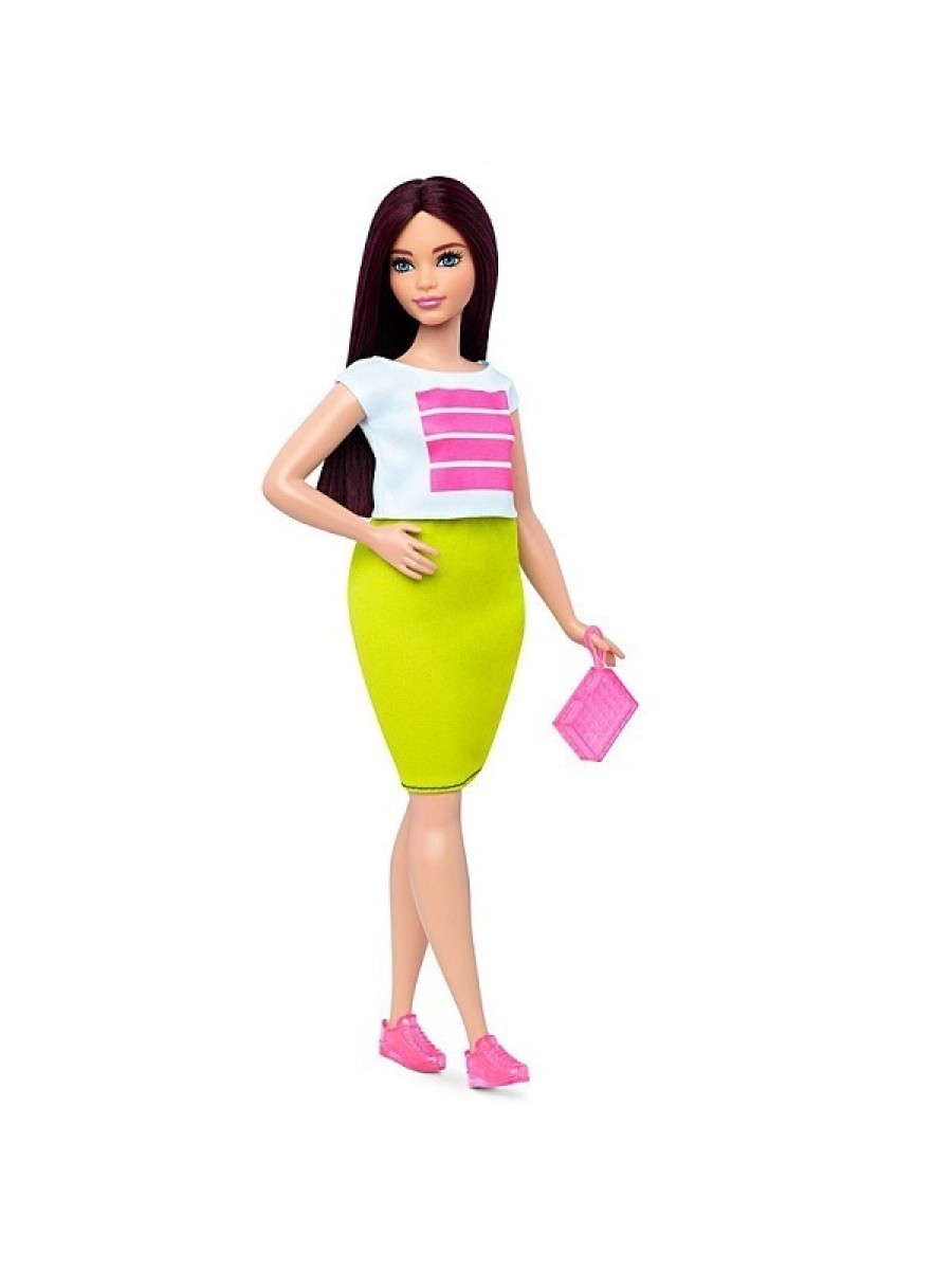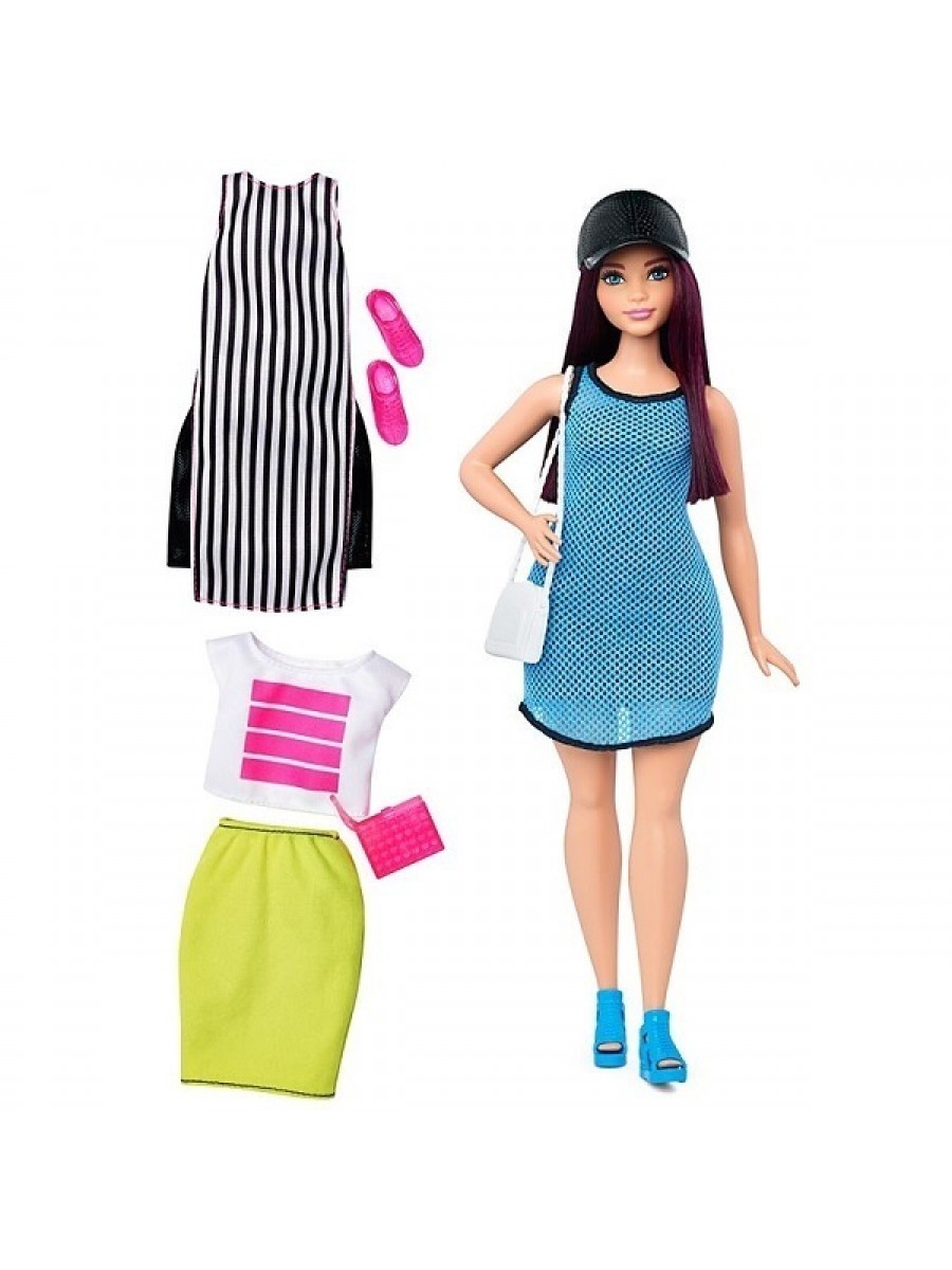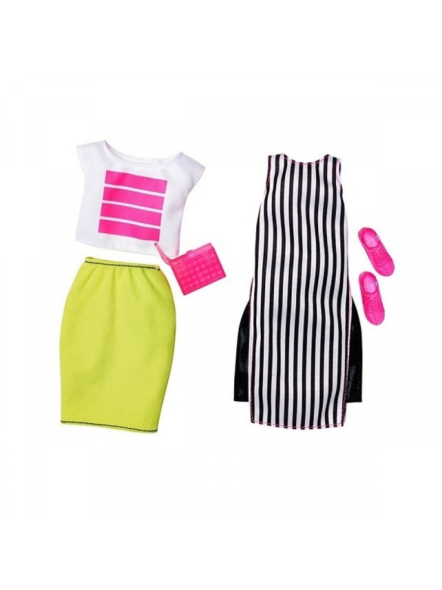 В наборе представлен спортивный образ в виде голубого сетчатого платья, романтичный - яркая салатовая юбка и белый топ и вечерний - полосатое платье с черными вставками по бокам. Красавица Барби имеет светлую кожу и длинные прямые волосы баклажанного оттенка. У нее подвижные ручки и ножки.