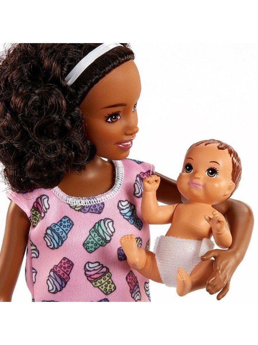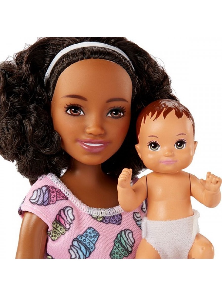 У Барби темная кожа, карие глаза и каштановые кудрявые волосы, которые можно расчесывать. На ней надета розовая футболка с рисунком из рожков мороженого, темная джинсовая юбка и зелёные кеды. Такой удобный наряд отлично подойдет Барби, чтобы посидеть со своей младшей сестренкой.